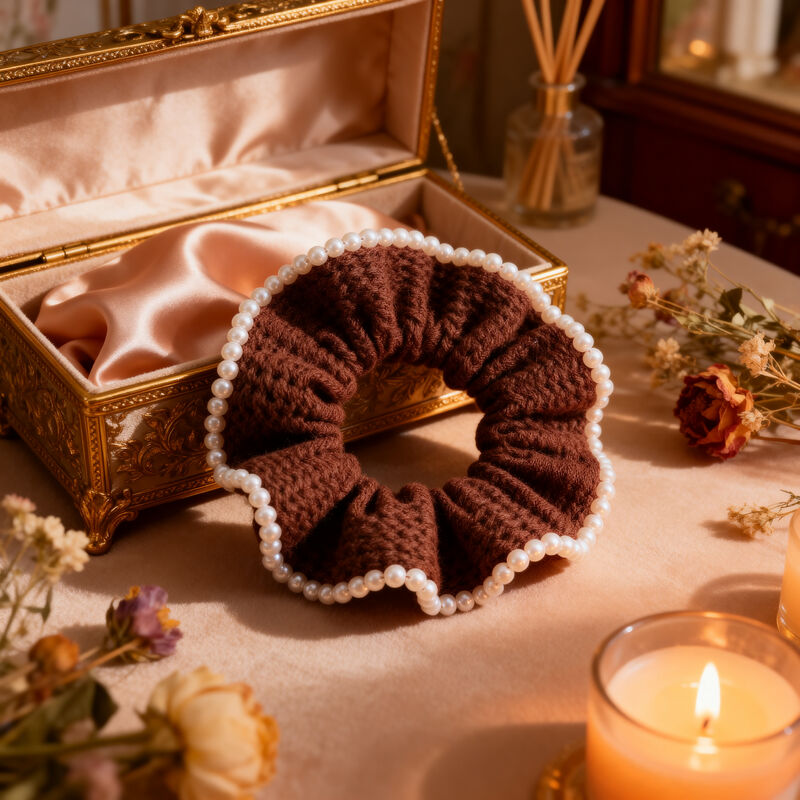 Acessórios de venda a quente, por atacado, de designers, de algodão orgânico, Scrunchies, branco, pérola, cabelo, Scrunchy, para mulheres, meninas.